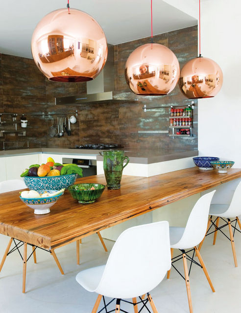 The white chairs are a perfect partner, and those brass lightings ain't bad either.